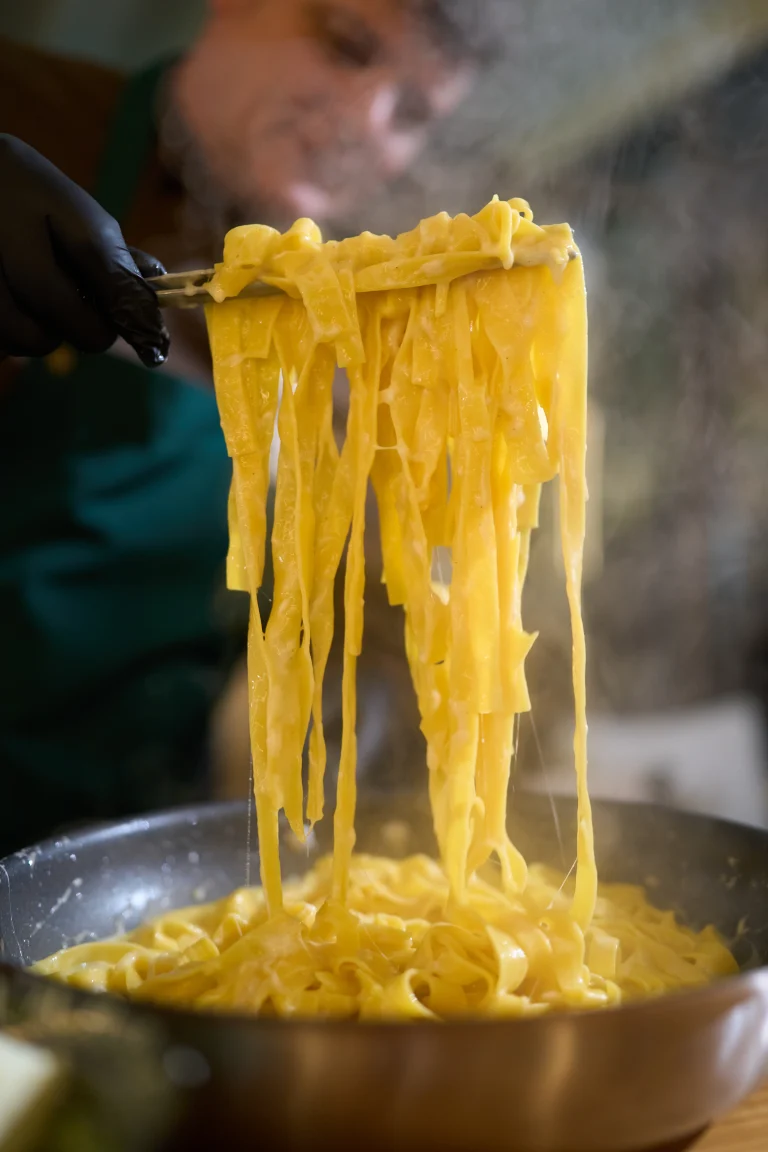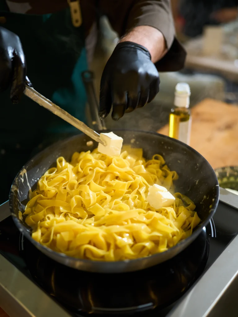 Tagliolini (fierți) (220g), Trufe negre (10g), Ulei de măsline (20g), Sare și piper (5g)